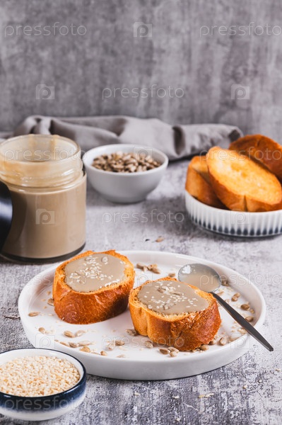 Урбеч из семян кунжута и подсолнечника на хлеб на тарелке вертикальный вид