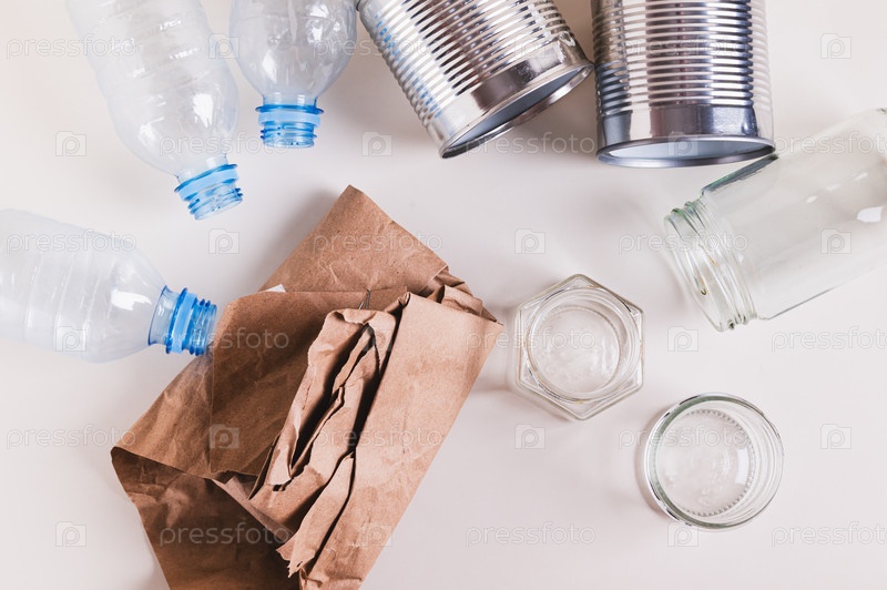 Бумага, стекло, металл и пластик для раздельного сбора отходов на столе
