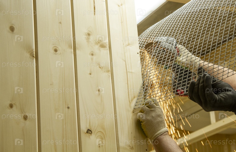На изображении показан человек, использующий угловую шлифовку для резки или формирования куска расширенной металлической сетки вблизи деревянного сооружения