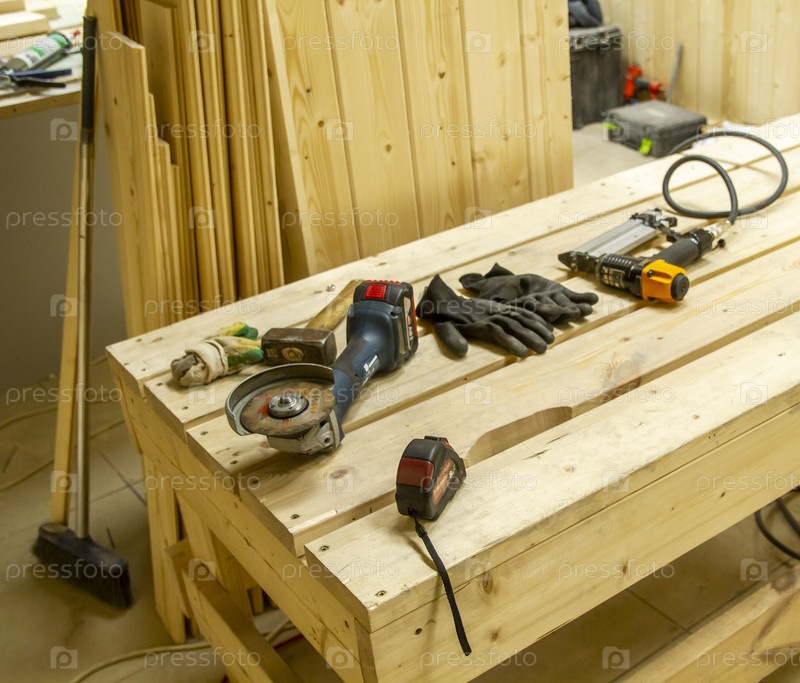 На изображении показаны различные деревообрабатывающие инструменты, расположенные на деревянном рабочем столе