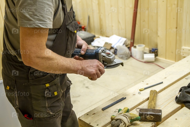 Изображение изображает сцену деревообработки с человеком, держащим портативный электрический инструмент, скорее всего мельницу или пилу, возле специально построенного деревянного рабочего стола