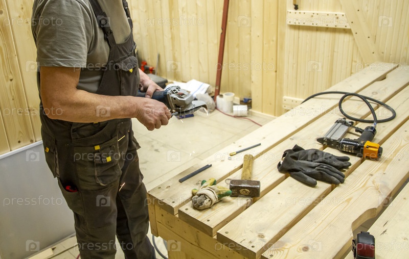 Изображение изображает сцену деревообработки с человеком, держащим портативный электрический инструмент, скорее всего мельницу или пилу, возле специально построенного деревянного рабочего стола