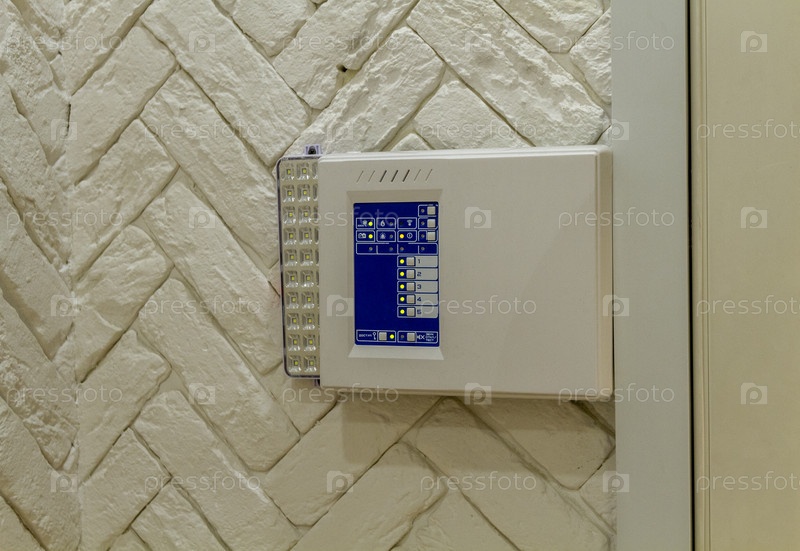 На изображении показана панель управления безопасностью, установленная на текстурированной белой стене