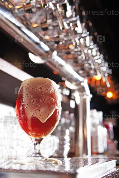 Темное пиво наливают до края стакана и выливают наружу. Пеновая пенка капает по бокам стекла. Крафт-пиво. Блестящие стальные краны для пива в пабе. Винтажный стиль. Пенастый алкогольный напиток. Барное оборудование