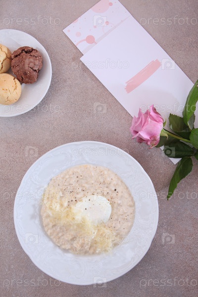 Овсяная каша на завтрак. Цветок розы на столе. Здоровый завтрак. Меню кофейни. Плоское питание. Вид сверху. Страница меню