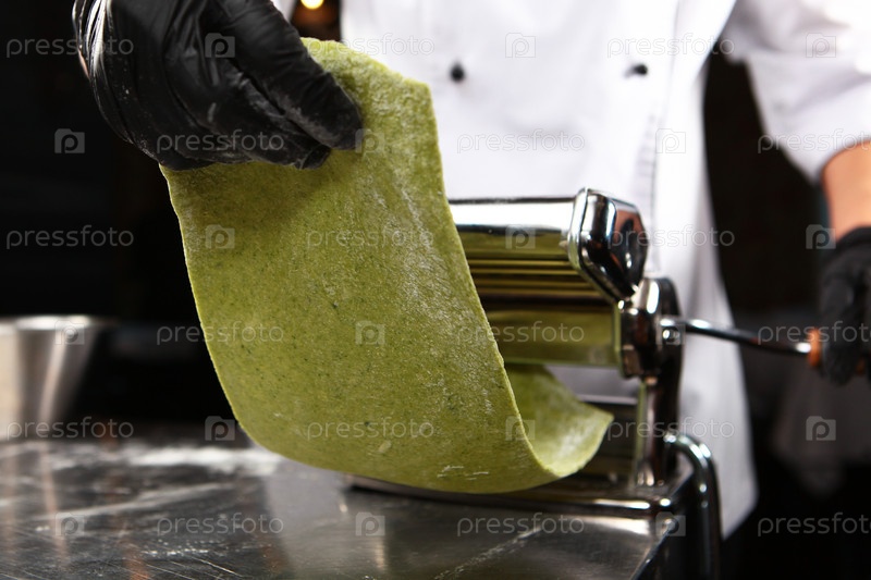 Свежие макароны со шпинатом. Шеф-повар в униформе готовит макаронные изделия со спанаком. Фото на черном фоне. Машина для приготовления макаронных изделий. Приготовление домашней пасты