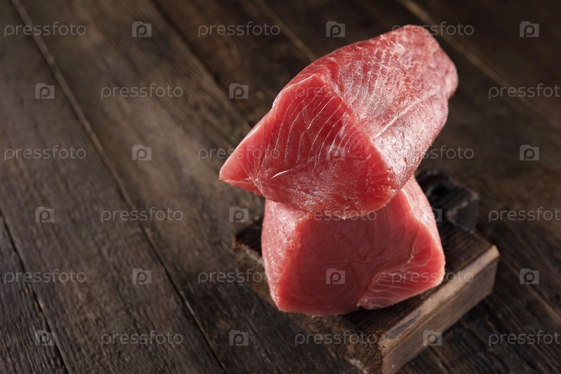 Филе свежего тунца для японской кухни.Большой кусок сырого красного тунца на деревянной доске.Большой кусочек сырой рыбной стейки для суши и сашими.Стейк с сырым туном.Копировальное пространство.Природные омега