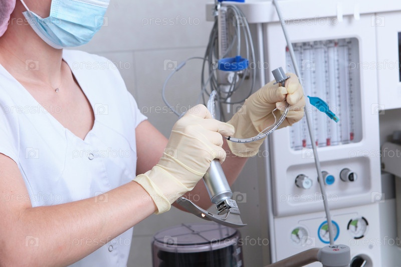 Ларингоскоп для трахеальной интубации и дыхательной трубы в руках анестезиолога.Проведение реанимации, искусственной вентиляции и общей анестезии.Концепция здравоохранения