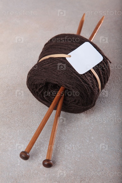 Скейн из коричневой шерстяной пряжи для ручного вязания. Деревянные спицы, сделанные из бамбука. Нить в скейне. Белый тег для текста. Ручные изделия. Концепция хобби