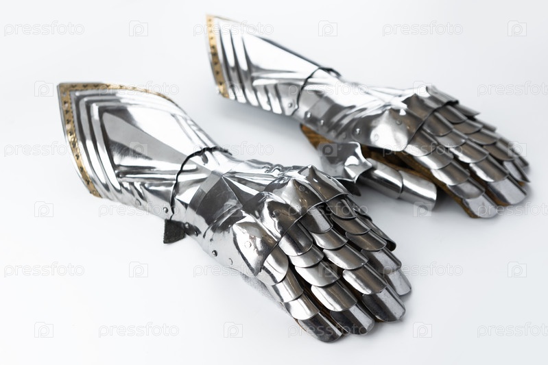 Рыцарские перчатки, сделанные из металла на белом фоне. рыцарская доспехи. рицарские защитные перчатки. копирование пространства. изолированный объект