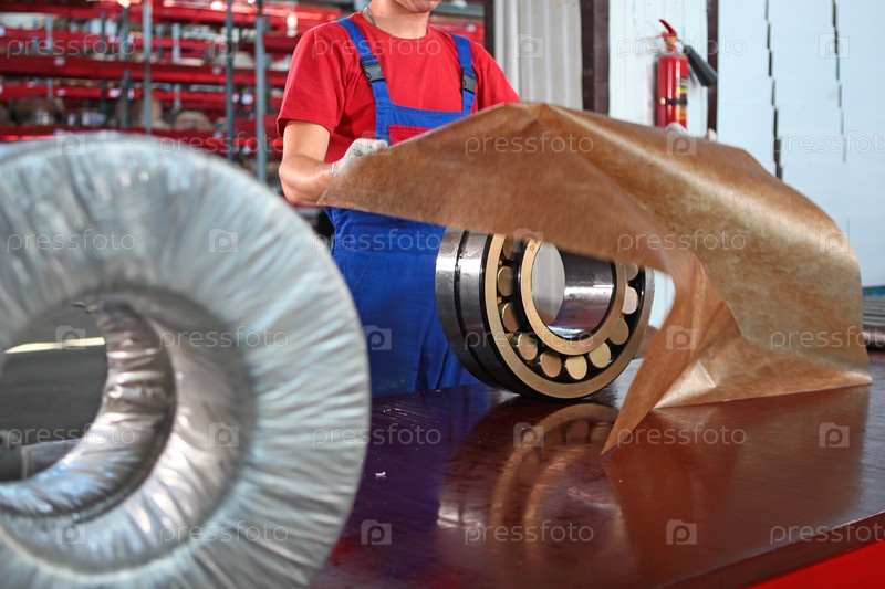 Упаковка подшипника для защиты от коррозии, загрязнения и механического повреждения. Хранение и транспортировка подшипников. Производство подшипников. Готовые продукты на фабрике. Тяжелая промышленность. Мастерская на заводе тяжелой промышленности