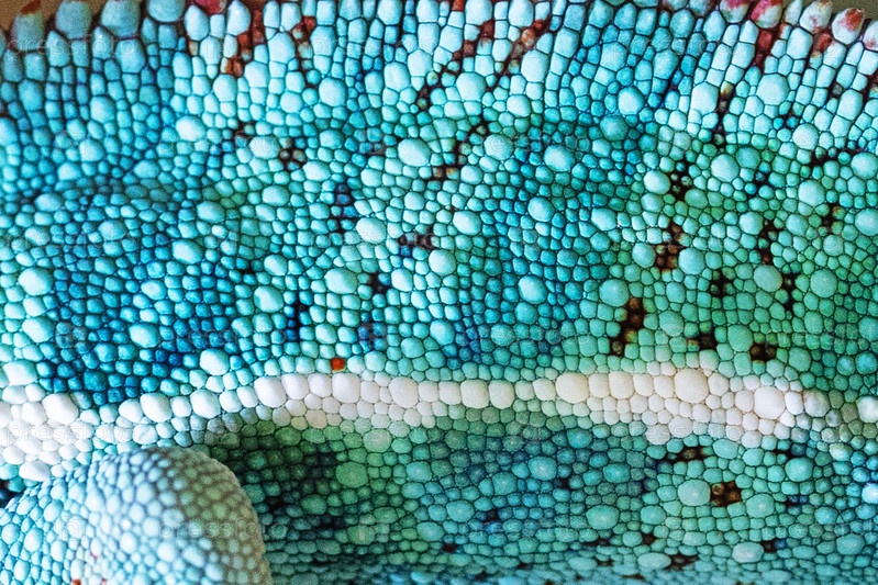 Фрагмент кожи хамелеона. Многоцветная кожа рептилии. Кожа хамелеона для фона или обоев. Близкий план