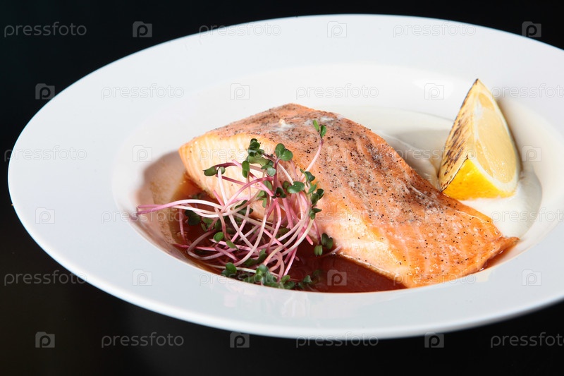 Филе жареного лосося с лимонным куском. Кусок лосося на белой тарелке, украшенный микрозелеными растениями и специями. Слиток запеченного лимона. Вкусное блюдо из морепродуктов. Здоровая еда