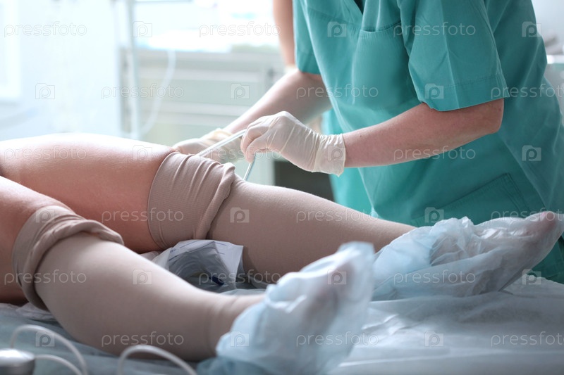 Компрессионное белье. Перед операцией на ноги пациента надевают компрессионное белье. Специальное нижнее белье перед хирургическим вмешательством. Профилактика варикоза. Современная медицина. Фотография в операционной