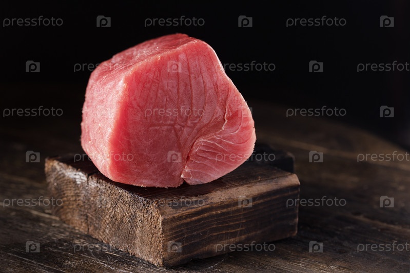 Большой кусок свежего тунца. Тунец для стейка. Свежая рыба. Здоровое и питательное блюдо. Природные омега. Темный фон. Копировальное пространство