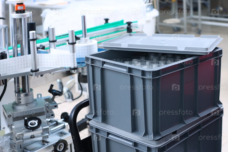 Производство косметики. Готовые продукты в пластиковой коробке. Конвейерная лента на заднем плане не сфокусирована
