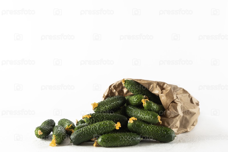 Свежие зеленые огурцы в бумажном пакете. Овощи для диетического питания. Экологически чистая упаковка овощей. Здоровое питание. Фермерские овощи. Копировальное пространство. Изолированный объект