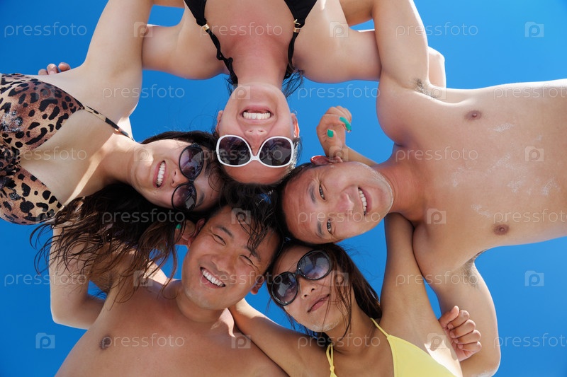 Группа счастливых молодых людей веселится на пляже