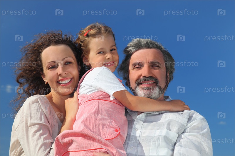 Семья с девочкой, матерью и дедушкой улыбаются и обнимаются, синий