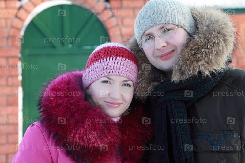 Красивая молодая женщина в красной куртке и мужчина в очках зимой