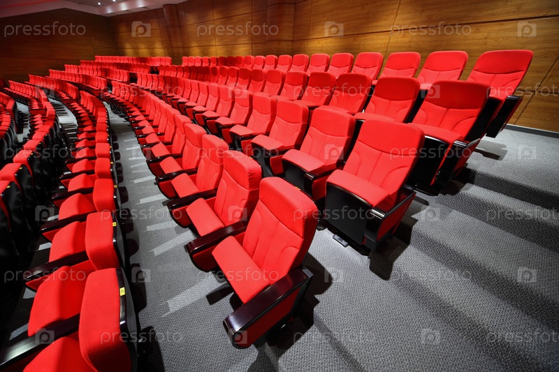 Ряд красных театральных сидений нежно изгибается в современной аудитории