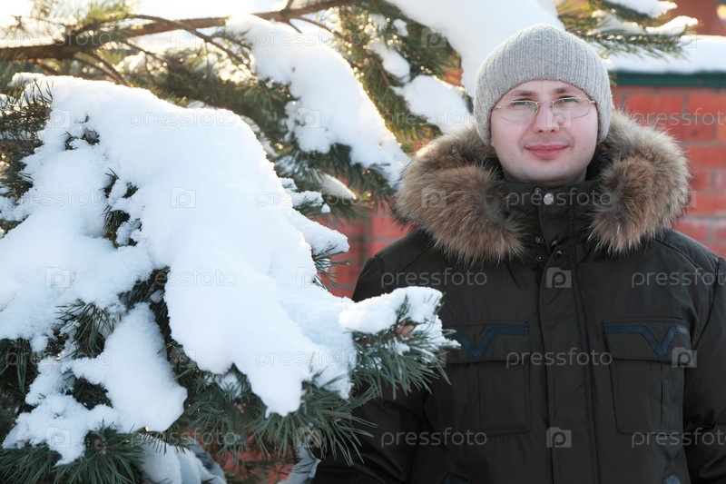 Мужчина стоит рядом с заснеженной сосновой деревней