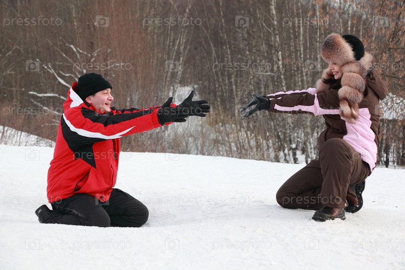 Мужчина и женщина сидят на снегу и протягивают друг другу руки,