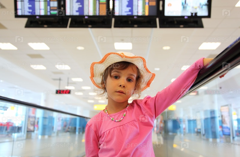 Красивая девочка в шляпе и розовой блузке едет по эскалаторам,