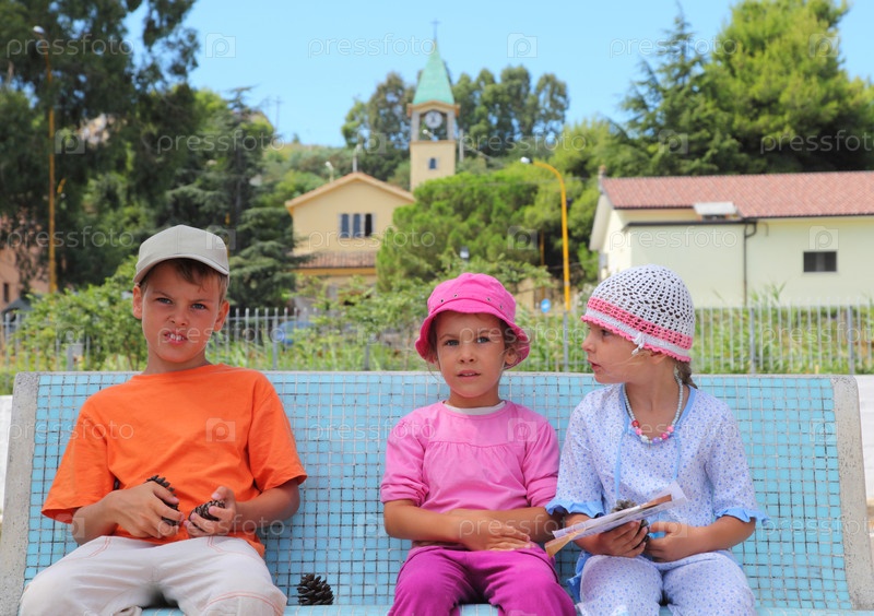 Маленький брат и две сестры сидят на голубой скамейке. мальчик