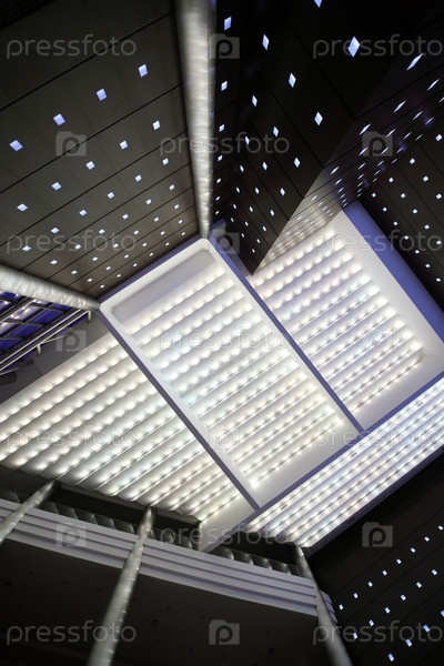 Современный потолок с светящимися световыми панелями и геометрическими узорами