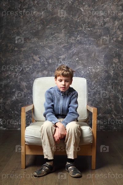 Маленький мальчик сидит на белом стуле в студии фотографа, коричневый