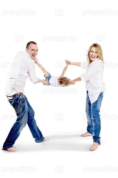 Отец и мать в белых рубашках и синих джинсах трясут ребенка