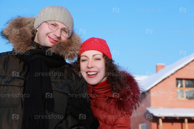 Красивая молодая женщина в красной куртке и мужчина в очках зимой