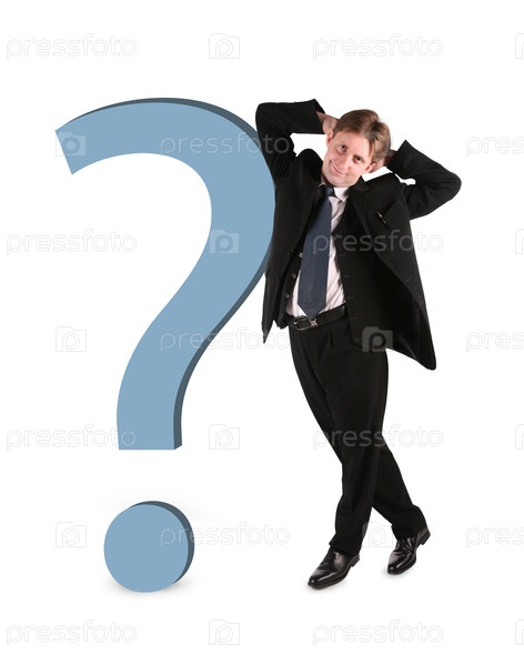 Бизнесмен позирует с большим синим вопросительным знаком