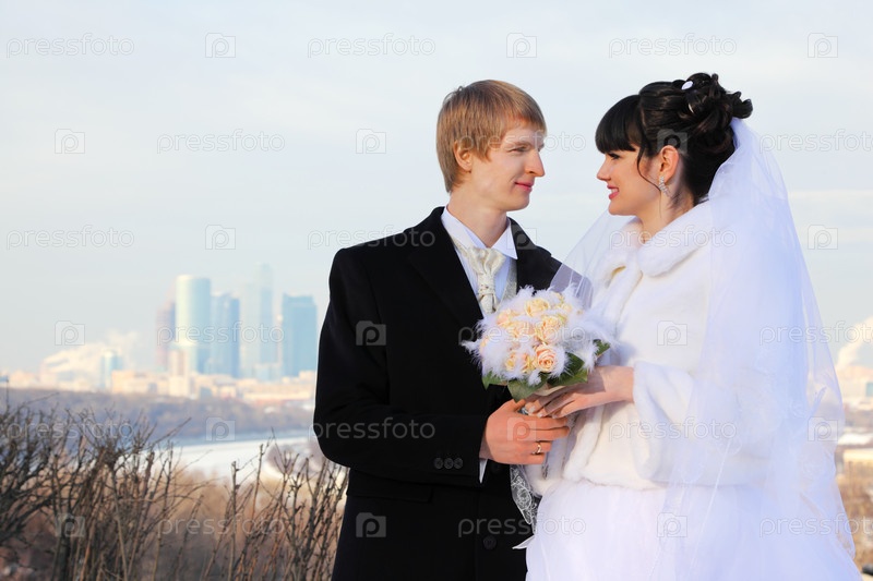 Улыбающиеся жених и невеста держат букет роз и смотрят друг на друга