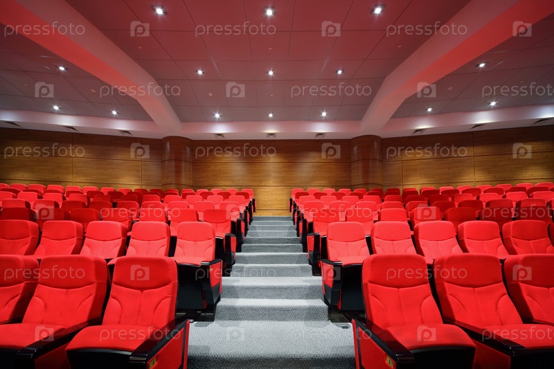 Красные сиденья выстраиваются в современную аудиторию с многоуровневыми рядами