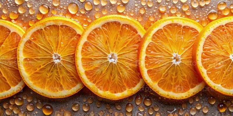 Свежие нарезы апельсина, расположенные в ряд с капельками воды на поверхности, подчеркивают их яркий цвет и текстуру
