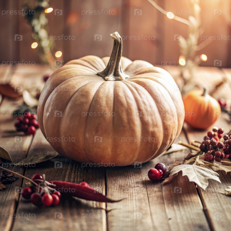 Осенний экран тыквы с ягодами и листьями на деревянном столке