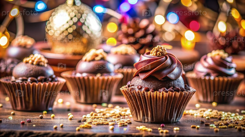 Вкусный шоколадный десерт, демонстрируемый в праздничной обстановке с огнями и декоративными элементами во время торжественного собрания