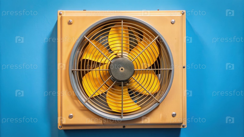 Стандартный выхлопный вентилятор, установленный на синей стене с видимыми лезвиями в действии