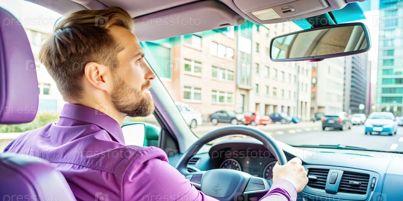 Мужчина едет по городу, глядя в зеркало заднего вида