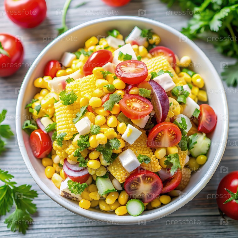 Красочный кукурузный салат со сладкой кукурузой, помидорами вишневыми, огурцами и травами, представленные в миске на деревянной поверхности