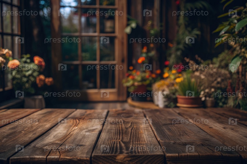 Рустическая деревянная поверхность с ярким садом в полуденном солнечном свете