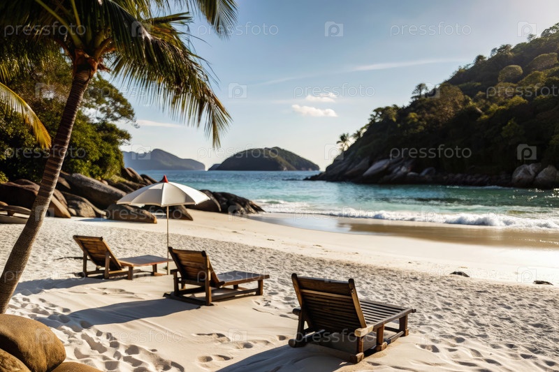 Расслабляющий летний пляж с потрясающим видом и белым песчаным побережьем