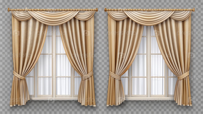 Элегантные декоративные оконные шторы в классическом дизайне, демонстрирующие мягкую ткань и стильные драпировки на прозрачном фоне