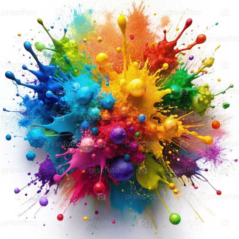 Красочные брызги краски создают художественный взрыв на нетронутом белом фоне, демонстрируя яркие оттенки и динамическое движение в абстрактном искусстве
