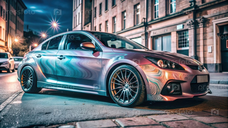 Автомобиль с яркой краской, припаркованный ночью на городских улицах