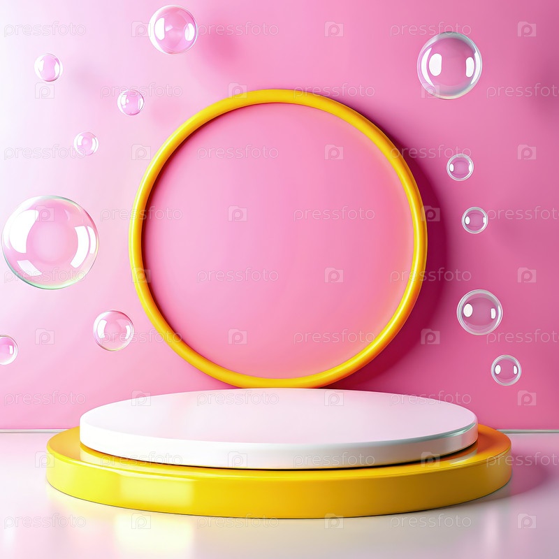 Яркая желтая платформа для подиума на розовом фоне с пузырями в веселой обстановке