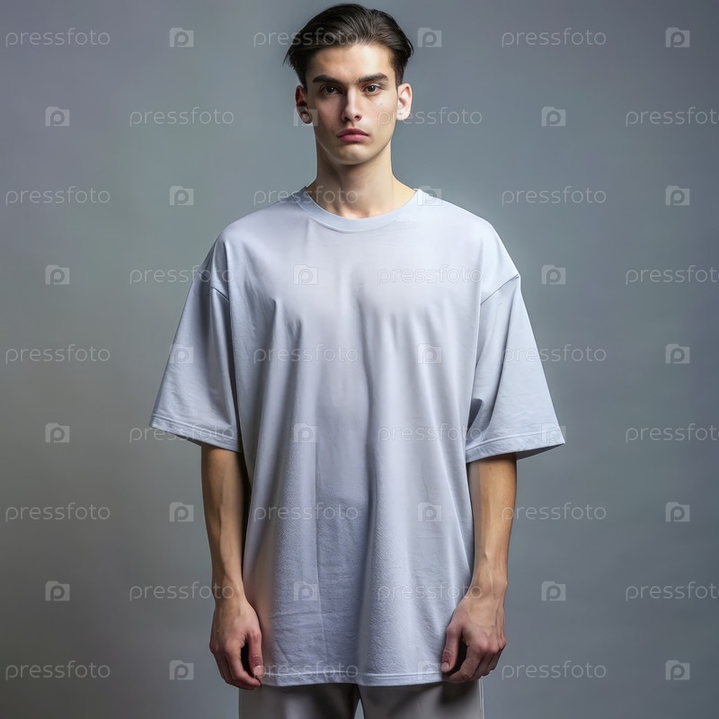 Человек, носящий большую серую футболку в минималистической студии