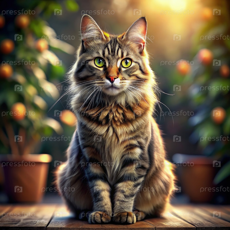 Королевская tabby кошка сидит грациозно в солнечном саду, окруженном апельсиновыми деревьями во время спокойного дня